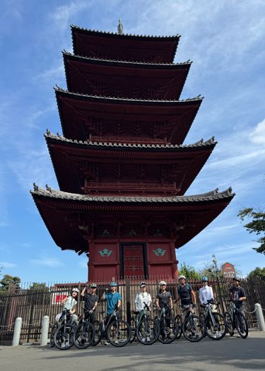 重厚な五重塔を背景に記念撮影を行い、ゴールのヤマハ バイクレンタル東京大森へ向けて再びペダルを踏み始めました。