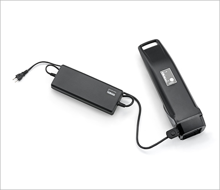 専用充電器につないで家庭用100Vコンセントで充電。車体に装着したままでも充電可能です。