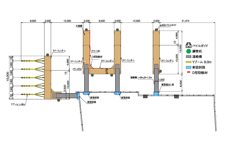 50フィートを超える大型漁船の係留を考慮し、緩衝幅の広いD型防舷材を一部に採用しています。