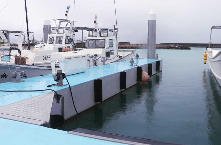 マグロをはじめとする様々な魚種が漁獲され県内外に出荷されています。また、海洋生物の生息場所を守るために、漁礁の設置や養殖場の整備なども行われています。さらなる、環境整備のためにFRP製の浮桟橋が新設されました。工事は三期に分けて行われ、第一期工事が完了しました。
