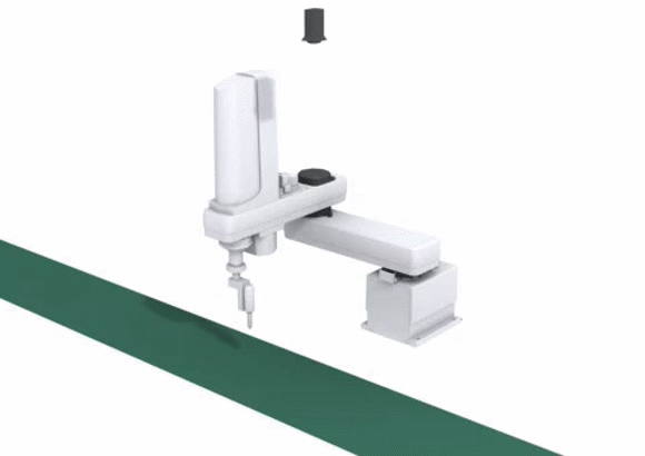 - 円筒座標型ロボットでは、このアプリケーションの場合、走行軸が必要となるが、スカラであれば直線補間をさせることで固定型で対応可。