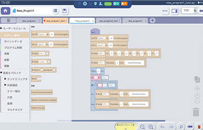 「ブロックプログラミング」=命令文が入ったブロックをつなぎ合わせてプログラム作成が可能です。※記述式プログラミングも可