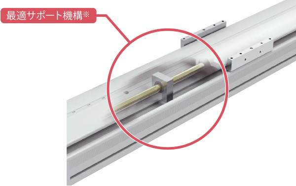 長いボールねじは高速動作で中央がたわみ、振動による共振で精度低下などを引き起こすため、従来速度を落とす必要がありました。ロングストロークタイプには当社独自の「最適サポート機構(特許取得済)」を搭載したことによ、りボールねじの振を抑えて速度低下を防止。広範囲ストロークで最高速2,400mm/secを実現し、従来機(FLIP-X GFタイプ)の約2倍の速さで動作可能となりました。