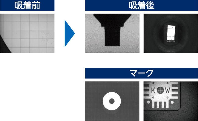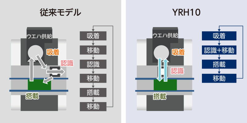 搭載ヘッドにスキャンカメラを装備し、ウエハ吸着後の部品認識を移動中に完了。最短距離で搭載位置への移動が可能となり、効率の良い動作サイクルを叶えることで生産性を向上。