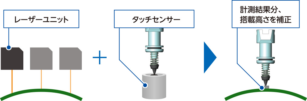 基板表面をレーザーで、ノズル高さをタッチセンサーで計測し、搭載高さへ反映。部品の打痕やバラマキを防止。